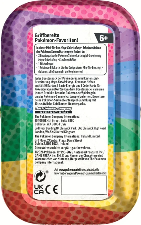 Die Pokémon ME2.5 Mega-Entwicklung – Erhabene Helden – Mini-Tin (Deutsch) ist das perfekte Sammlerstück im handlichen Format. Ideal für unterwegs, als Geschenk oder zum gezielten Öffnen einzelner Booster – jede Mini-Tin überzeugt mit stylischem Metall-Design und spannenden Karten aus der beliebten Spezial-Erweiterung.