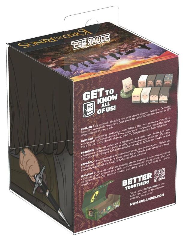 Sammelbox zur Aufbewahrung von TCG-Decks, Tabletop-Spielzubehör und/oder Sammlerstücken. Die Aragorn Squaroe aus der Herr der Ringe-Edition fasst bis zu 100 Karten in doppelten Schutzhüllen, wenn sie als Deckbox verwendet wird. Squaroes werden zu 78 % aus nachwachsenden Rohstoffen hergestellt und passen perfekt in die separat erhältliche Collectors Case.