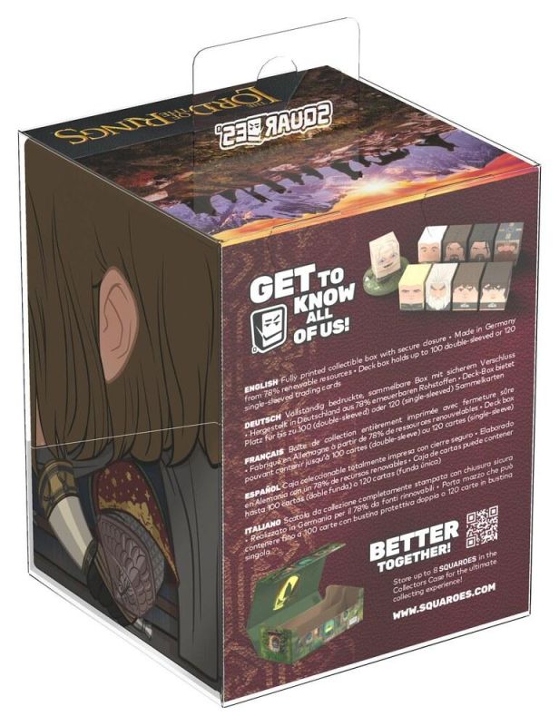 Sammelbox zur Aufbewahrung von TCG-Decks, Tabletop-Spielzubehör und/oder Sammlerstücken. Die Boromir Squaroe aus der Herr der Ringe-Edition fasst bis zu 100 Karten in doppelten Schutzhüllen, wenn sie als Deckbox verwendet wird. Squaroes werden zu 78 % aus nachwachsenden Rohstoffen hergestellt und passen perfekt in die separat erhältliche Collectors Case.